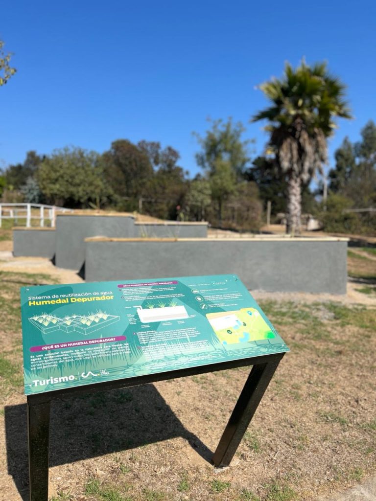 – Humedal depurador: sistema que trata aguas grises provenientes de la piscina, restaurante y lavandería para su reutilización en el riego de áreas verdes. Aporta eficiencia hídrica y genera además un ecosistema vivo que atrae biodiversidad y funciona como espacio educativo para visitantes.