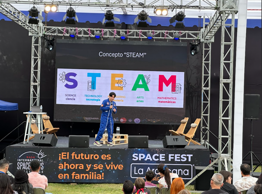 En 2024 logramos algo histórico: organizamos por primera vez el NASA Space Apps Challenge Chile, con sede principal en Santiago, y lo combinamos con un evento abierto a la comunidad denominado Space Fest, realizado en nuestro Centro Recreacional de La Araucana. Allí se reunieron más de 300 participantes en la hackatón y más de 2.000 asistentes diarios en el festival, creando un espacio único de encuentro entre jóvenes, estudiantes, académicos, startups, empresas, científicos y familias completas.