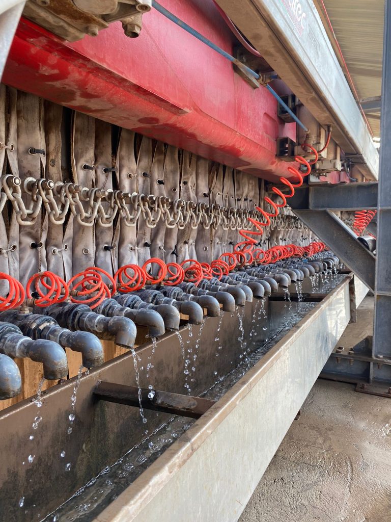3) Filtro Prensa (2022): La etapa final que exprime la máxima cantidad de agua de los lodos de áridos, devolviéndola al proceso y generando bloques casi secos de material de desecho.