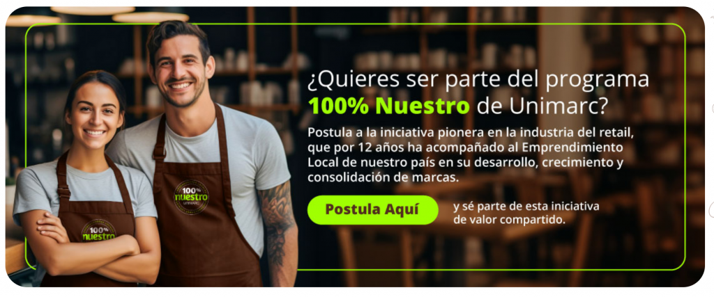 Desde la creación del programa 100% Nuestro a la fecha, más de 400 emprendedores locales, de distintas regiones del país, han podido posicionar sus productos en las góndolas de Unimarc, una vitrina comercial de alcance nacional que considera aproximadamente 300 tiendas distribuidas en 16 regiones. Además, contempla presencia en nuestro e-commerce y página web exclusiva, otorgándoles visibilidad y oportunidades de crecimiento a los pequeños productores.